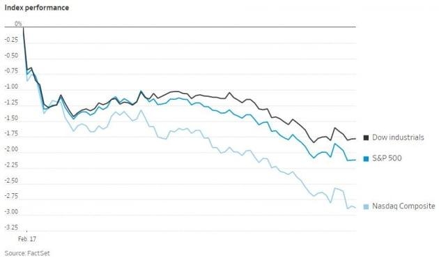 금융시장은 안전자산 선호로 급격히 기울었습니다. 뉴욕증시의 주요 지수는 -0.6~-0.8% 내림세로 출발한 뒤 시간이 갈수록 내림 폭을 확대했습니다. 결국, 다우는 1.78%, S&P500 2.12% 급락했고 나스닥은 2.88%나 떨어진 채 거래를 마쳤습니다. 다우는 올해 들어 가장 큰 폭의 하락을 기록했습니다.