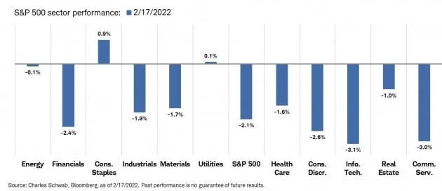 11개 업종 가운데 유틸리티, 필수소비재 등 경기 방어적 성격을 지난 두 개 업종만 강세를 보였습니다. 엔비디아가 작년 4분기 전년 동기보다 54% 증가한 매출, 69% 늘어난 이익(EPS)을 공개했지만 7.56% 급락한 것에서 드러나듯이 성장주는 약세를 면치 못했습니다.