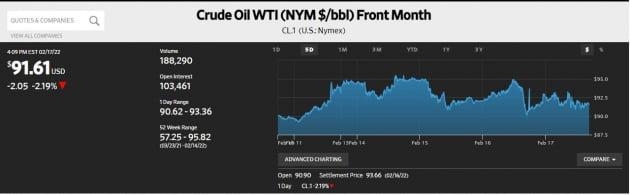 '안전자산'의 대명사 금값은 1.6% 올라 온스당 1900달러를 넘었고, 일본 엔, 스위스 프랑도 강세를 보였습니다. 반면 비트코인 가격은 급락했습니다.이런 상황이라면 유가는 폭등해야 할 텐데 브렌트유와 서부텍사스원유는 각각 2%대 하락해서 배럴당 92달러, 91달러 수준에서 거래를 마쳤습니다. 전날 미국 국무부의 네드 프라이스 대변인이 오스트리아 빈에서 진행 중인 이란과의 핵 협상이 '최종단계'에 있다고 밝힌 영향입니다. 이란과의 협상이 타결된다면 최소 하루 100만 배럴 이상의 원유가 국제 원유 시장에 공급될 것입니다. 월가 관계자는 "러시아가 전쟁을 일으켜 유가가 치솟으면 높은 인플레이션에 발목 잡힌 바이든 대통령은 궁지에 처할 것"이라며 "지금으로선 이란과의 합의 외엔 유가에 대응할 방법이 많지 않다"라고 말했습니다. 리포오일의 앤디 리포 설립자는 CNBC 인터뷰에서 "이란이 보유한 막대한 원유 재고가 시장에 나오면서 유가는 단기에 배럴당 3~5달러 떨어질 것"이라고 밝혔습니다.