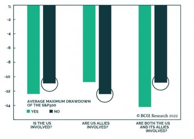 전쟁이 발발한다면 금융시장은 한동안 어려움을 겪을 겁니다. BCA리서치는 "우크라이나 사태가 아직 해결되지 않고 있다"라며 "주식을 매수하기에는 너무 이르다"라고 밝혔습니다.BCA리서치에 따르면 주요 지정학적 위기가 터졌을 때 과거 S&P500 지수 하락 폭은 위기 규모와 성격에 따라 11~15%에 달했습니다. 우크라이나 전쟁이 터진다면 미국은 직접 관여하지는 않겠지만 핵심 동맹인 나토 동맹국들은 관여할 수 있습니다. S&P500 지수가 영향받을 수밖에 없습니다.