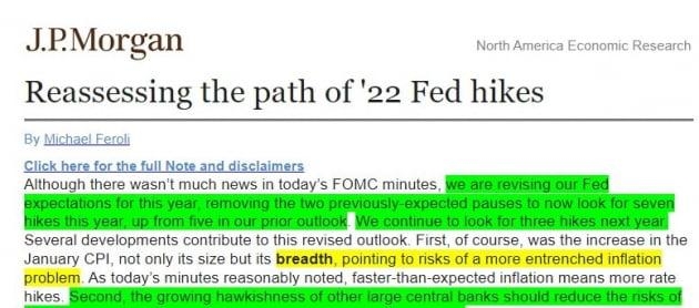 이 회의록이 발표된 뒤 몇 시간 지나 JP모간은 올해 Fed의 기준금리 인상 예상 횟수를 기존 다섯 번에서 일곱 번으로 상향 조정하는 보고서를 내놓았습니다. JP모간도 월가의 컨센서스인 일곱 번 인상에 동참한 것이죠. 마이크 페롤리 수석 이코노미스트는 "1월 FOMC 회의록에는 많은 뉴스가 없었지만, 올해 Fed 기준금리에 대한 전망치를 바꿔 올해 7번의 인상할 것으로 예상한다. 기준금리는 내년에도 3번 더 인상될 것"이라고 밝혔습니다.