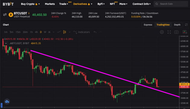 ▲비트코인 1일봉 차트 (출처 : 바이비트 거래소)자주색 선은 큰 조정이 시작한 12월 초부터 이어진 하락 추세선을 표시한 것이다. 3만3000달러까지 하락했다가 반등을 보이면서 하락 추세선을 이탈한 상황이었는데, 지난밤 크게 하락하긴 했지만 하락 추세선 위를 지키고 있다. 만약 3만8000달러까지 하락할 경우 추세선 안으로 복귀하는 것이 된다. 그때는 막바지 큰 조정을 한 번 더 이어가는 것을 의미한다.