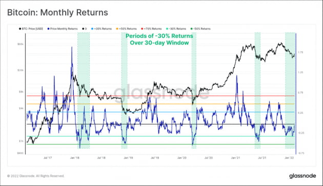 ▲비트코인 월별 수익률 차트 (출처 : glassnode)이 온체인 지표는 30일간의 비트코인 수익률(백분율)을 보여주고 있고, 30%보다 낮은 음의 수익률은 대개 과매도 상황을 의미한다고 볼 수 있다.