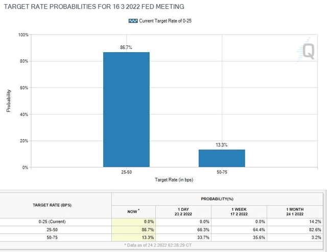 오늘도 미국 증시가 롤러코스터를 탔습니다. 3대 지수 모두 하락 출발했던 뉴욕 증시는 특히 나스닥이 3% 넘게 오르며 모두 상승 마감했죠. 어디서 변곡점이 생겼냐를 볼 필요가 있습니다. 해외 여러 매체들이 바이든 대통령의 기자회견과 증시 변동을 연관시키고 있는데, 사실 그 이전부터 떨어졌던 지수가 위로 올라가는 흐름이 있었습니다. 연관해서 생각해볼 부분은 어제 짚어드린대로 월가에서 현실화 될 수 있다고 봤던 '빅 스텝' 시나리오, 3월 기준금리 0.5% 인상 가능성이 점점 흐려지고 있다는 점입니다. 연방 기금 금리를 오늘자 페드워치 데이터에 따르면 연준이 3월 금리를 0.25% 올릴 가능성은 86.7%로 높아졌고, 0.5%p 인상 가능성은 13.3%로 줄어든 것으로 나타났습니다. 오늘 장에서 기술주들의 상승이 두드러진 것도 이같은 맥락과 무관하지 않을 겁니다.