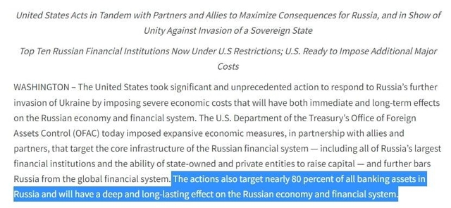 재무부에 따르면 이번 제재 대상이 된 두 곳은 러시아 전체 은행 시스템의 절반을 차지합니다. 러시아의 금융기관들이 매일 460억달러 규모의 외환 거래를 수행하는데 그 가운데 80%가 달러화 거래였으니, 미국의 제재 조치가 러시아 금융 시스템에 큰 타격을 줄 것이라는 논리입니다.