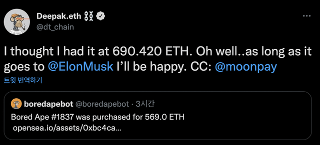 유명 대체불가토큰(NFT) 수집가 Deepak.eth가 25일(현지시간) 자신의 트위터를 통해 "일론 머스크 테슬라 최고경영자(CEO)가 BAYC #1837을 569이더리움(ETH)에 구매했다"고 주장했다. 569ETH은 약 150만달러에 달한다.