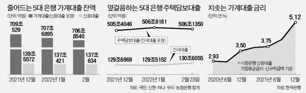 개인들의 체감 이자부담이 그만큼 커졌기 때문이라는 평가다. 한국은행에 따르면 가계대출 가중평균금리(예금취급은행 신규 취급 신용대출 금리 기준)는 2020년 6월 연 2.93%에서, 작년 말 연 5.12%까지 올라갔다. 5대 은행 신용대출 잔액은 전년 말보다 2조4938억원 급감한 137조634억원으로 집계됐다.