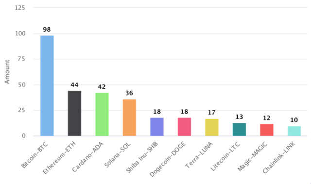 4위~10위에는 솔라나(SOL, 36회), 시바이누(SHIB, 18회), 도지코인(DOGE, 18회), 테라(LUNA, 17회), 라이트코인(LTC, 13회), 매직(MAGIC, 12회), 체인링크(LINK, 10회) 등이 이름을 올렸다.