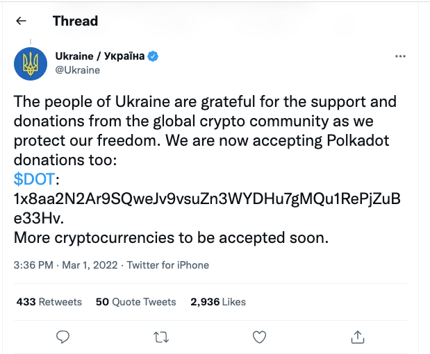 우크라이나 공식 트위터 계정은 1일 "우리는 전 세계에서 가상자산(암호화폐)을 통해 기부금을 받고 있다"면서 "현재 우리는 폴카닷(DOT) 기부도 받고 있다. 사람들은 더 많은 가상자산으로 우리에게 기부할 수 있을 것"이라고 밝혔다.
