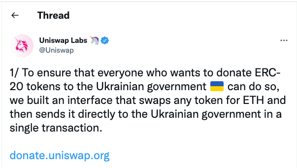 이더리움(ETH)의 대표적인 탈중앙거래소(DEX) 유니스왑(UNI)은 1일 공식 트위터를 통해 "사용자가 모든 이더리움계열(ERC-20) 토큰을 손쉽게 ETH으로 환전하고 우크라이나 정부에게 기부할 수 있도록 자체적인 인터페이스를 구현했다"고 밝혔다.