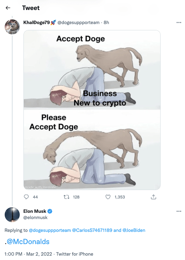머스크 "맥도날드, 도지코인(DOGE) 수용해달라" 시사수정 오전 6:34 · 2022. 03. 02.입력 오전 6:29 · 2022. 03. 02.기사출처강민승 기자00공유하기링크 복사텔레그램엑스카카오톡일론 머스크 테슬라 최고경영자(CEO)는 2일 "도지코인(DOGE)을 지원해달라. 부탁이다"라는 글귀가 포함된 트위터 게시물을 맥도날드 공식 계정에게 리트윗했다. DOGE 가격은 이날 20시 27분 바이낸스 USDT 마켓을 기준으로 전일대비 1.81% 오른 0.1346달러에 거래되고 있다. DOGE강민승 기자minriver@bloomingbit.io안녕하세요 블루밍비트 기자입니다.