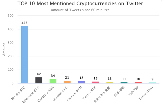 2일(현지시간) 가상자산(암호화폐) 마켓 데이터 플랫폼 코인트렌즈닷컴(CoinTrendz.com)에 따르면 이날 오후 5시 기준 1시간 동안 트위터에서 가장 많이 언급된 가상자산은 비트코인(BTC, 423회)으로 나타났다.