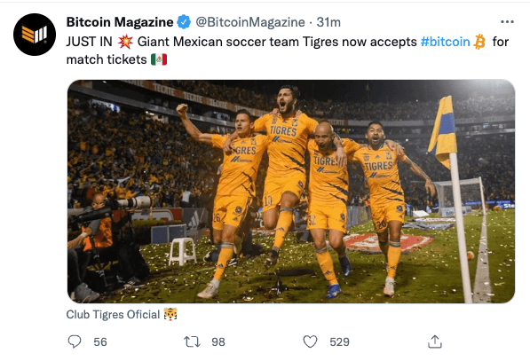 "멕시코 축구팀 티그레스, 비트코인(BTC)으로 티켓 결제 지원"