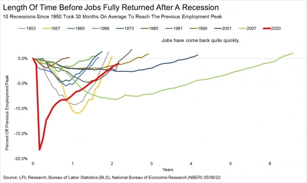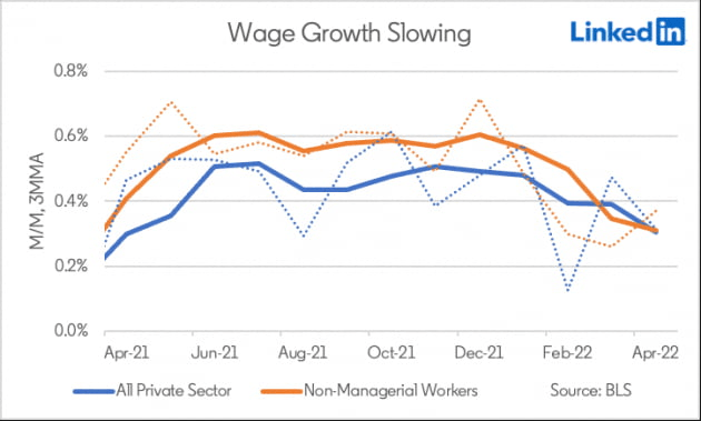 일부에서는 딱 적당한 골디락스 수준의 고용이라는 주장도 나왔습니다. 4월 신규고용이 전달과 비슷하고 3개월 평균으로 보면 작년 고점에서 조금씩 내려오고 있다(둔화)는 것이죠. LPL파이낸셜의 제프리 로치 수석 이코노미스트는 "고용의 부드러운 하락 추세는 경착륙 없이 수요를 냉각시키는 Fed의 골디락스 시나리오의 시작점이 될 수 있다"라고 밝혔습니다.