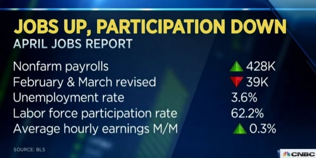 금리 상승엔 이날 오전 8시 30분 발표된 4월 고용보고서도 영향을 줬습니다. 보고서엔 희망과 불안이 섞여 있었습니다. 월가 관계자는 "혼재된 지표였지만, 투자자들은 중립적이라기보다는 빡빡한 고용 상황에 더 무게를 실을 듯하다"라고 설명했습니다.