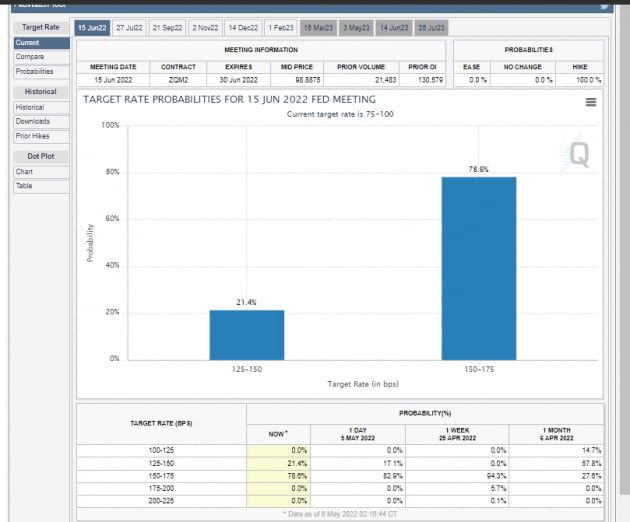 이날 발언에 나선 Fed 스피커들은 파월 의장이 부인한 '75bp 인상' 가능성을 조금 되살려 놓았습니다. 토마스 바킨 리치먼드 연방은행 총재는 인플레이션과 싸움에서 75bp 인상안을 포함해 어떤 것도 테이블에서 제외하지 않을 것이라고 밝혔습니다. 시카고선물거래소의 연방기금금리 선물 시장에서는 75bp 인상에 대한 베팅이 다시 높아졌습니다.