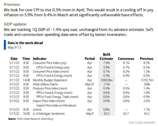 투자자 관심은 다음 주 11일 발표되는 4월 소비자물가지수(CPI)에 쏠려 있습니다. 현재 월가 컨센서스는 전년 대비 헤드라인 수치 8.1%(3월 8.5%), 근원 수치 6.1%(6.5%)입니다. 전월 대비로는 헤드라인 0.2%(1.2%), 근원 0.4%(0.3%)입니다. 전반적으로 3월보다 낮아질 것이라는 관측이 강한 것이죠. 이는 중고차 가격이 또다시 전달보다 1% 하락(만하임 중고차 지수 기준)한 데다, 휘발유 가격이 워낙 높은 수준이지만 지난 3월보다는 4월에 낮아졌기 때문입니다. 뱅크오브아메리카의 경우 헤드라인 수치가 전년 대비 7.9%, 근원 수치 5.9%로 나올 것으로 예상합니다. 또 전월 대비로는 0.1%, 0.3%에 그칠 것으로 봅니다.