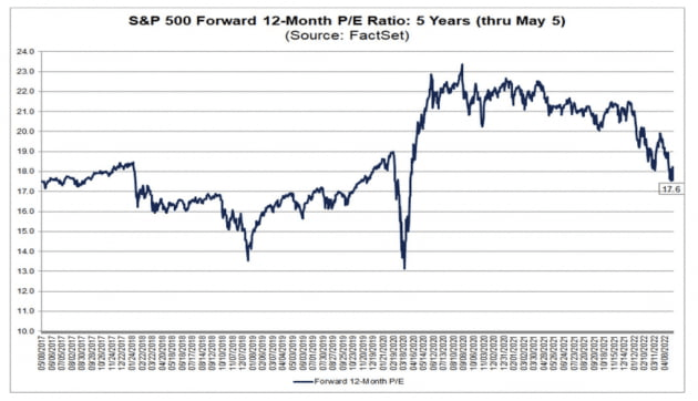 주가는 많이 낮아졌습니다. 올해 들어 다우지수는 10%가량 하락했고, S&P500지수는 14%가량, 나스닥지수는 23%가량 밀렸습니다. 이에 따라 12개월 선행 주가수익비율(PER)은 17.6배로 떨어졌습니다. 5년 평균(18.6)보다는 낮지만 10년 평균(16.9)보다는 높습니다. 그러나 피델리티의 저리엔 팀머 매크로 디렉터는 "역사적으로 2년물 국채 금리와의 상관관계를 통해 유추해보면 S&P500 지수의 주가수익비율(P/E)은 15.6배 수준에 있어야 한다. 지금은 17.8배 수준"이라고 지적했습니다. 게다가 금리는 자꾸 올라가고 있습니다. 또 기준이 되는 기업 이익도 아직은 괜찮지만, 불안감이 있습니다. 팩트셋에 따르면 이날까지 S&P500 기업의 87%가 1분기 실적을 발표한 가운데 이 중 79%가 주당순이익(EPS)이 월가 추정치를 넘었습니다. 이는 5년 평균인 77%를 상회합니다. 하지만 추정치를 넘은 수준은 4.9%에 그칩니다. 이는 5년 평균인 8.9%보다 낮습니다.