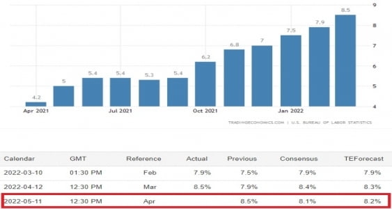 월스트리트저널이 집계한 전문가 4월 CPI 예상치는 지난해 동기 대비 8.1% 상승입니다. 전달 기록한 1981년 12월 이후 최고치인 8.5% 상승에서 낮아진 수치입니다. 4월의 전월 대비 상승률도 0.2%로 전달의 1.2%보다 크게 낮아질 것으로 전망되고 있습니다.