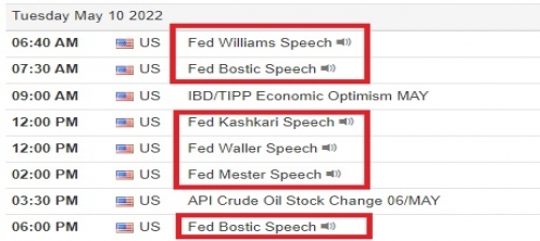 항상 '자이언트 스텝' 같은 충격 발언으로 시장에 쇼크를 줬던 제임스 불러드 세인트 루이스 연은 총재는 현재까지 연설 일정을 잡지 않았습니다. 올해 FOMC 표결권이 있는 불러드 총재는 3월 FOMC 때 유일하게 25bp 인상에 반대했지만 5월 FOMC에서 50bp 인상에 찬성했습니다.