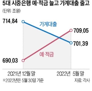 국내 5대 시중은행의 정기 예·적금 잔액이 한 달 새 18조원가량 늘어난 것으로 나타났다. 반면 가계대출 잔액은 5개월 연속 감소세를 이어갔다.