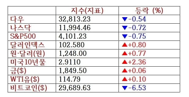뉴욕증시는 1일(현지시간) 하락했다. 뉴욕증권거래소(NYSE)에서 다우지수는 전 거래일 대비 176.89포인트(0.54%) 하락한 3만2813.23에 마감했다. S&P500지수는 30.92포인트(0.75%) 하락한 4101.23에, 기술주 중심의 나스닥지수는 86.93포인트(0.72%) 내린 1만1994.46에 거래를 마쳤다.