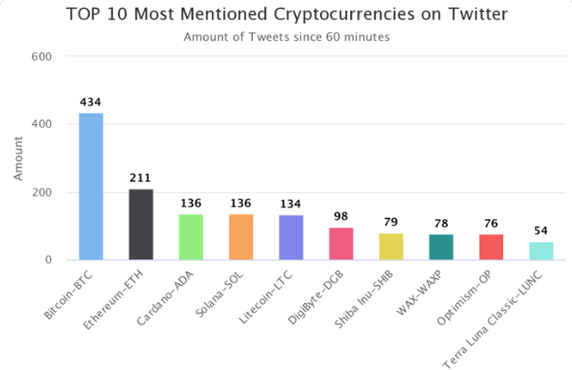 4위~10위에는 라이트코인(LTC, 134회), 디지바이트(DGB, 98회), 시바이누(SHIB, 79회), 왁스(WAXP, 78회), 옵티미즘(OP, 76회), 테라 루나 클래식(LUNC, 54회) 등이 이름을 올렸다.