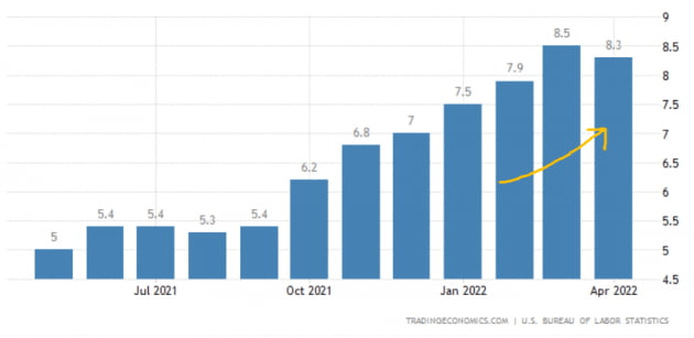 미 소비자물가는 지난 4월 8.3%(작년 동기 대비) 급등한 상태다. 전달(8.5% 상승)보다는 둔화했으나 여전히 40여년만에 가장 높은 수준을 유지하고 있다. 5월 물가가 되레 상승하거나 소폭 하락에 그칠 경우 Fed 긴축을 더 압박할 수 있다. 증시엔 부정적인 요인이다.