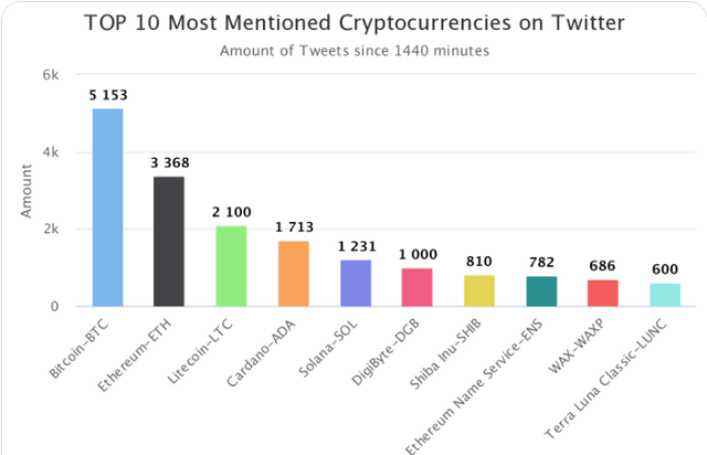 4위~10위에는 카르다노(ADA, 1713회), 솔라나(SOL, 1231회), 디지바이트(DGB, 1000회), 시바이누(SHIB, 810회), 이더리움 네임 서비스(ENS, 782회), 왁스(WAXP, 686회), 테라 루나 클래식(LUNC, 600회) 등이 이름을 올렸다.