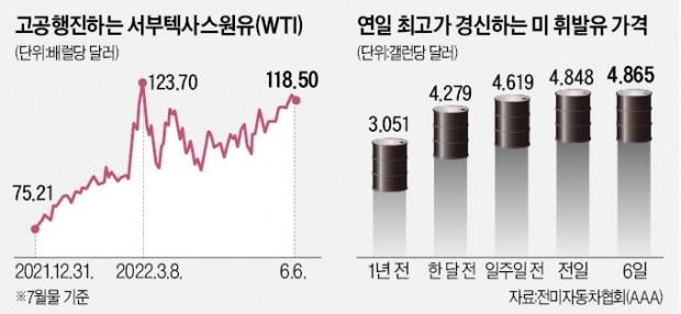 미국에서는 여름 휴가철을 맞아 휘발유 수요가 증가세다. 미 에너지정보청(EIA)은 5월 마지막주 원유 재고가 507만 배럴 줄어 시장 추정치(135만 배럴)를 크게 웃돌았다고 밝혔다. 미국자동차협회(AAA)에 따르면 미 휘발유 평균 가격은 연일 사상 최고가를 새로 쓰고 있다. 이날 가격은 갤런당 4.865달러로 전년 동기보다 59% 상승했다.