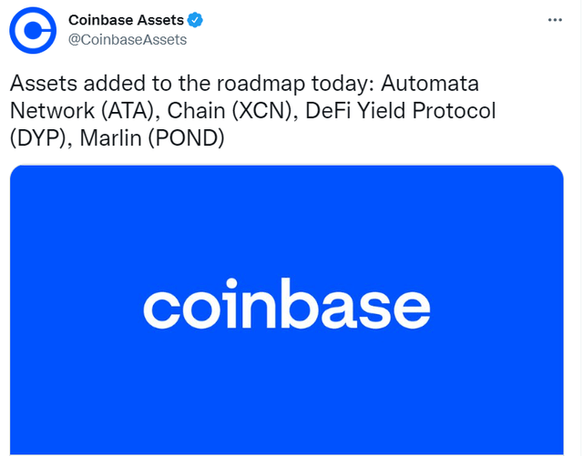 코인베이스, ATA·XCN·DYP·POND 상장 로드맵 추가수정 오전 11:26 · 2022. 06. 07.입력 오전 11:25 · 2022. 06. 07.기사출처김정호 기자00공유하기링크 복사텔레그램엑스카카오톡가상자산(암호화폐) 거래소 코인베이스가 7일(현지시간) 공식 트위터를 통해 오토마타(ATA), 체인(XCN), 디파이 일드 프로토콜(DYP), 말린(POND)을 상장 로드맵에 추가했다고 공지했다. XCNATADYPPOND김정호 기자reporter1@bloomingbit.io안녕하세요 블루밍비트 기자입니다.