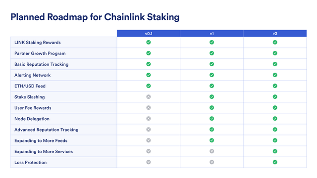 스테이킹 이자는 연 5% 수준으로, 기간은 이용자가 선택할 수 있다. 체인링크 측은 커뮤니티에서 스테이킹 V0.1의 충분한 검증을 거친 후 V1과 V2도 릴리즈한다는 방침이다.
