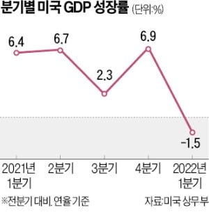 지난 1분기 미국 GDP 성장률은 -1.5%를 기록해 7개 분기 만에 처음으로 마이너스 성장으로 돌아섰다. 통상 2분기 연속 마이너스 성장을 하면 경기침체 국면에 진입한 것으로 본다.