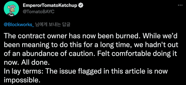앞서 업계 전문가들은 유가랩스가 BAYC를 제한없이 발행할 수 있다는 점을 지적한 바 있다. 이에 유가랩스 측은 작년 6월 해당 코드를 삭제하겠다고 답했으나 제거까지는 1여년이 걸렸다.