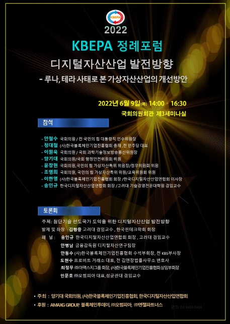 9일 이데일리에 따르면 이날 오후 2시 국회에서 ‘디지털자산산업 발전방향-루나, 테라 사태로 본 가상자산산업의 개선방안’ 포럼이 열릴 예정이다.