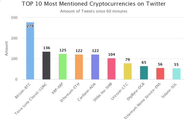 4위~10위에는 이더리움(ETH, 122회), 카르다노(ADA, 122회), 시바이누(SHIB, 104회), 라이트코인(LTC, 79회), 디지바이트(DGB, 65회), 이더리움 네임 서비스(ENS, 56회), 솔라나(SOL, 55회) 등이 이름을 올렸다.