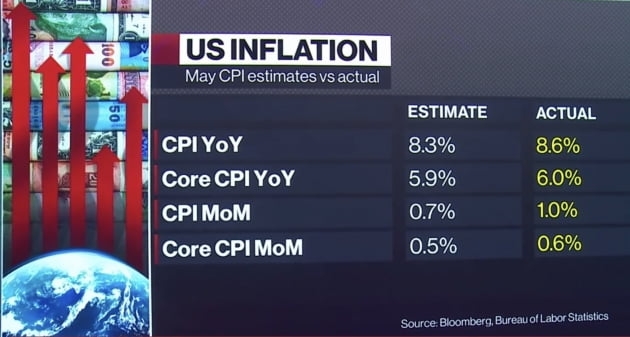 미국의 소비자물가가 40년 만의 최고인 8.6%까지 치솟으면서 긴축 공포가 커지고 있다. 경기 침체 우려도 함께 증가하면서 뉴욕 증시는 폭락세를 보이고 있다.미 노동부는 5월 소비자물가지수(CPI)가 전년 동월보다 8.6% 급등했다고 10일(미 동부 시간) 발표했다. 4월(8.3%)보다 오름폭이 커진 것은 '정점'으로 믿었던 지난 3월(8.5%)을 넘어 1981년 12월 이후 최대폭 상승을 기록했다. 월가 예상치는 8.3%였다. 전월 대비로도 1.0% 급등해 지난 4월(0.3%) 수치와 시장 예상(0.7%)을 크게 상회했다. 에너지·식품을 제외한 근원 CPI는 전년 동월보다 6.0%, 전월보다 0.6% 올랐다. 지난 4월(6.2%, 0.6%)보다 전년 대비 수치는 줄었지만, 전월 대비 상승률은 동일했다.