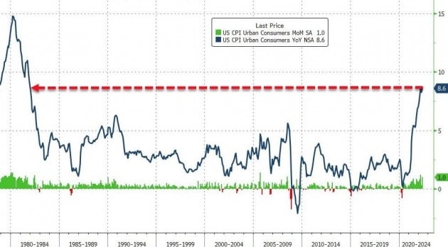 미 노동부에 따르면 5월 소비자물가지수(CPI)는 작년 동기 대비 8.6% 뛴 것으로 나타났습니다. 1981년 12월 이후 41년 만의 최고치입니다. 시장 예상치인 8.3%도 웃돌았습니다.