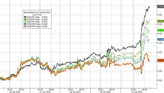 바클레이즈와 제프리스, 캐피탈이코노믹스는 더욱 극적인 전망을 내놨습니다. 이 3곳의 투자기관들은 “Fed가 다음주 통화정책 회의에서 금리를 75bp 올릴 것”으로 봤습니다.강한 긴축 우려에 미 국채 금리는 장·단기를 가리지 않고 급등했습니다.