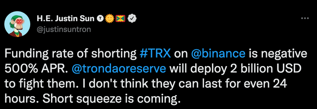 13일(현지시간) 선은 자신의 트위터에 "현재 바이낸스 선물 마켓에서 트론 펀딩 비율은 -500% APR(Annual Percentage Rate)을 기록하고 있다"며 이같이 밝혔다.