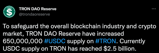 트론 다오 리저브(TRON DAO Reserve)가 트론(TRX)에 6억5000만 USD코인(USDC)를 추가 공급했다.