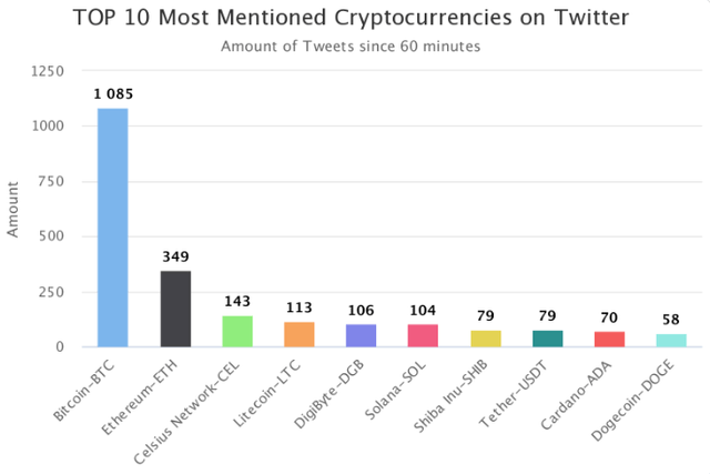 13일 가상자산(암호화폐) 마켓 데이터 플랫폼 코인트렌즈닷컴(CoinTrendz.com)에 따르면 이날 오후 1시 기준 1시간 동안 트위터에서 가장 많이 언급된 가상자산은 비트코인(BTC, 1085회)으로 나타났다.