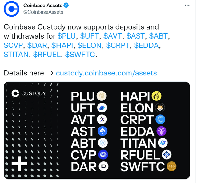 코인베이스 커스터디, 플루톤(PLU) 등 14종 입출금 지원수정 오후 1:32 · 2022. 06. 13.입력 오후 1:32 · 2022. 06. 13.기사출처김정호 기자00공유하기링크 복사텔레그램엑스카카오톡미국 가상자산(암호화폐) 거래소 코인베이스 커스터디가 13일(현지시간) 공식 트위터를 통해 플루톤(PLU), 유니랜드(UFT), 벤투스(AVT), 에어스왑(AST), 아크블록(ABT), 파워풀(CVP), 다크루스(DAR), 파이코인(HAPI), 일런(ELON), 크립테리움(CRPT), 에다(EDDA), 타이탄(TITAN), 리오디파이(RFUEL), 스위프트(SWFTC)의 입출금을 지원한다고 공지했다. TITANDABTASTAVTCRPTCVPEDDAELONHAPIPLURFUELSWFTCUFT김정호 기자reporter1@bloomingbit.io안녕하세요 블루밍비트 기자입니다.