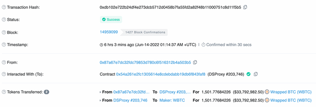 셀시우스(Celsius)가 14일(현지시간) 오전 1시 14분과 42분, 두 차례에 걸쳐 총 2001WBTC를 메이커다오(MakerDAO)에 추가 입금하며 청산가를 계속해서 낮추고 있다.