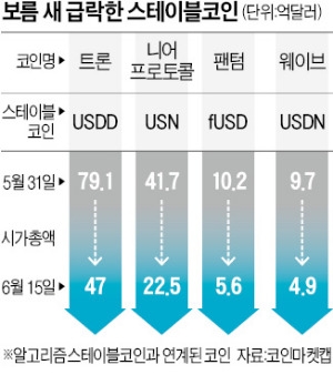 15일 암호화폐 시황 사이트 코인게코에 따르면 알고리즘 스테이블코인 USDD와 연동된 트론은 오후 4시 기준 0.05달러로 전날보다 19.33% 떨어졌다. 이날 비트코인(-6.5%)과 이더리움(-7.8%)의 두 배를 뛰어넘는 하락폭이다. 루나 사태 직전(0.09달러) 대비로는 44.4% 주저앉았다. USDN과 연동된 웨이브는 루나 사태 이후 13달러에서 4달러로 66% 급락했다.