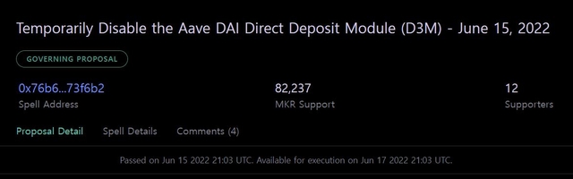 메이커다오 측은 해당 리스크가 해소되기 전까지 아베 D3M의 비활성화를 유지할 계획이다.