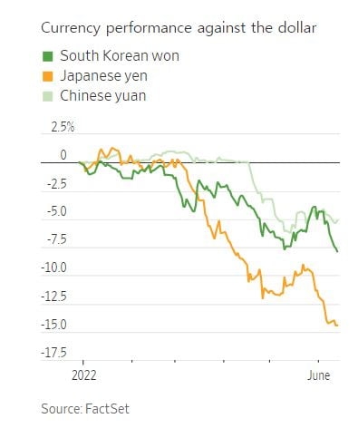 Fed는 지난 15일 기준금리를 75bp(1bp=0.01%포인트) 인상했다. 1994년 이후 가장 빠른 속도의 인상이다. Fed의 긴축은 달러 강세를 부추겨 WSJ의 달러 지수는 올해 9% 올랐다. 2002년 이후 최고 수준이다.게다가 아시아의 중국과 일본은 국내 인플레이션 압박이 상대적으로 적다는 이유로 긴축을 거부하고 있다. 이에 따라 일본 엔화는 올해 달러 대비 14% 하락했고, 중국 위안화는 5% 떨어졌다.