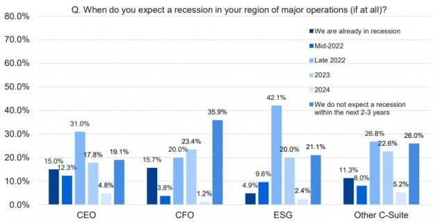 설문에 응한 글로벌 기업 CEO에 한정해 세부 시기별로 나눠 살펴보면 15%는 이미 경기침체에 진입한 것으로 본다고 답했다. 올해 연말까지 경기침체가 일어날 것이라고 답한 비율은 58.3%로 뛰었다. 내년까지로 범위를 늘려 잡을 경우 76.1%가 경기침체를 예상했다.