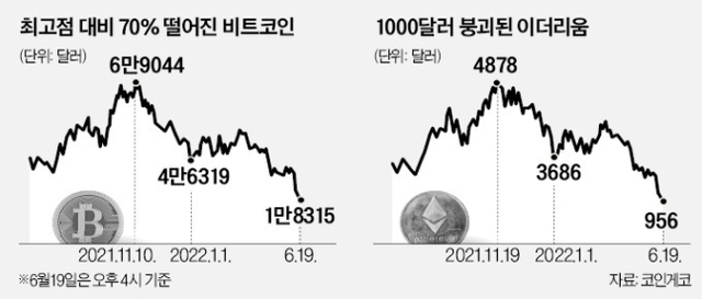 19일 비트코인 2만달러, 이더리움 1000달러 선이 무너지자 월스트리트저널(WSJ)과 CNBC, 블룸버그 등 해외 주요 언론은 일제히 이같이 보도했다. 주요 암호화폐 가격이 2017년 이전으로 되돌아간 셈이다. 코인을 예치받아 대출해주던 ‘코인 은행’들도 투자자들의 출금 신청이 빗발치면서 지급 불능 사태에 빠졌다. 코인 은행에서 코인을 대출받아 각종 투자에 나선 투자사들도 줄줄이 파산 위기에 몰렸다.
