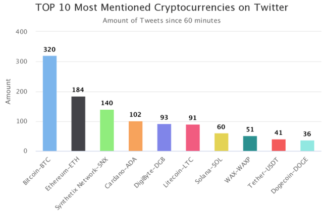 20일 가상자산(암호화폐) 마켓 데이터 플랫폼 코인트렌즈닷컴(CoinTrendz.com)에 따르면 이날 오후 4시 기준 1시간 동안 트위터에서 가장 많이 언급된 가상자산은 비트코인(BTC, 320회)으로 나타났다.